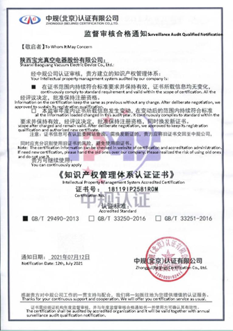 Recently, Zhonggui(Beijing) Certification Co., Ltd conducted deliberate and careful audit on Intellectual Property Management System of Shaanxi Baoguang Vacuum Electric Device Co., Ltd. from 2020 to the first half year of 2021 as planned including each management department and every manufacture unit as well as its fulfillment. Finally Shaanxi Baoguang succeeded in passing IPMS surveillance audit.