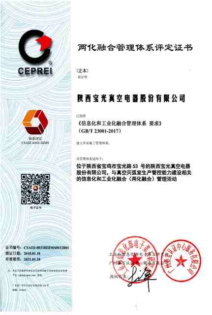 1月25日,一起草 www.17c.com股份收到了由工信部電子第五研究所頒發的《兩化融合管理體(tǐ)係評定證書》,標誌著一起草 www.17c.com股份兩化融合管理體係正式通過了國家認證,一起草 www.17c.com股份也成為國內電真空(kōng)行業(yè)首家取得國家兩化融合(hé)管理體係認證的企業。