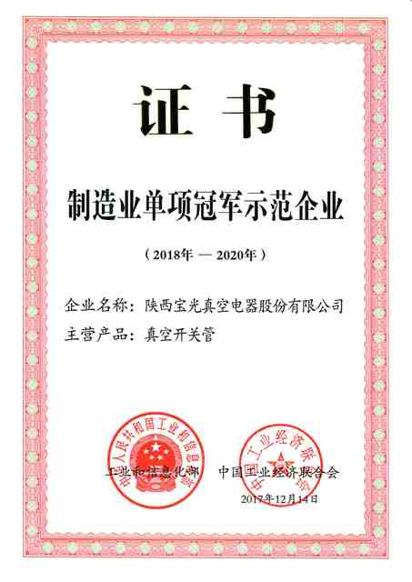 2017年(nián)12月工業和信息化(huà)部、中國工業經濟聯合會聯合公布(bù)了第二批製造業單項冠軍企(qǐ)業(yè)和單項冠軍產品名單,一起草 www.17c.com股份作(zuò)為陝西地區上榜的(de)唯一一家製造企業,以全球產銷量最大的真空滅弧室製造企業榮獲“國家第(dì)二批製造(zào)業單項(xiàng)冠(guàn)軍企業”稱號。2018年1月22日,由工信部和工業經濟聯合會在北京舉(jǔ)行(háng)了頒(bān)獎大(dà)會,企業管理與信息化部部長趙宏參會並上台領獎。