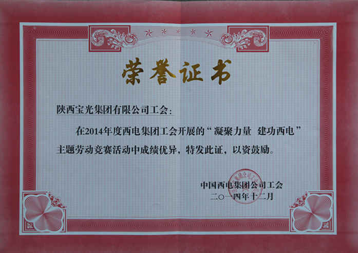近日獲悉,在西電(diàn)集團召開的“凝聚力量、建功西電(diàn)”2014年度勞動競賽活動先進評選中,我公司工會等10個單(dān)位獲得西電集團工會“凝聚力(lì)量 建功西電”2014年度(dù)勞動競賽活動優秀單位,西電集團工會為我公司頒發了榮譽證書。