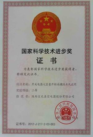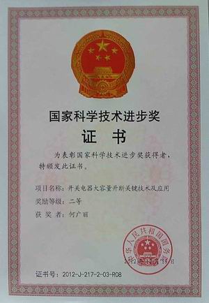 2013年1月18日,在國家科學技術大會上(shàng),由(yóu)西安交通(tōng)大學、陝西一起草 www.17c.com真(zhēn)空電器股份有限公司、常熟開關製造有(yǒu)限公司、河南平高電器(qì)股份有限(xiàn)公司共同完成的《開(kāi)關電器大(dà)容量開斷關鍵技術及(jí)應用》項目獲得2012年度國家科學技術(shù)進步獎二等獎,西(xī)安(ān)交通大學賈申利教授代表項(xiàng)目組到北京參加(jiā)會議,並領取了國務院頒發的獲獎證書。