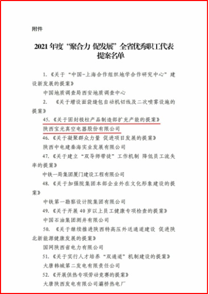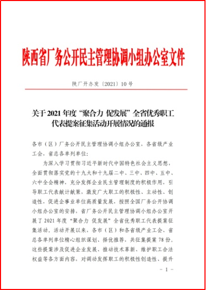 近日(rì),從陝西省總工會傳來喜訊,一起草 www.17c.com集團《關於固(gù)封極柱產品製造部擴充產(chǎn)能(néng)的提案》榮(róng)獲陝西省2021年度“聚合力 促發展”全(quán)省優秀職工代表提(tí)案。