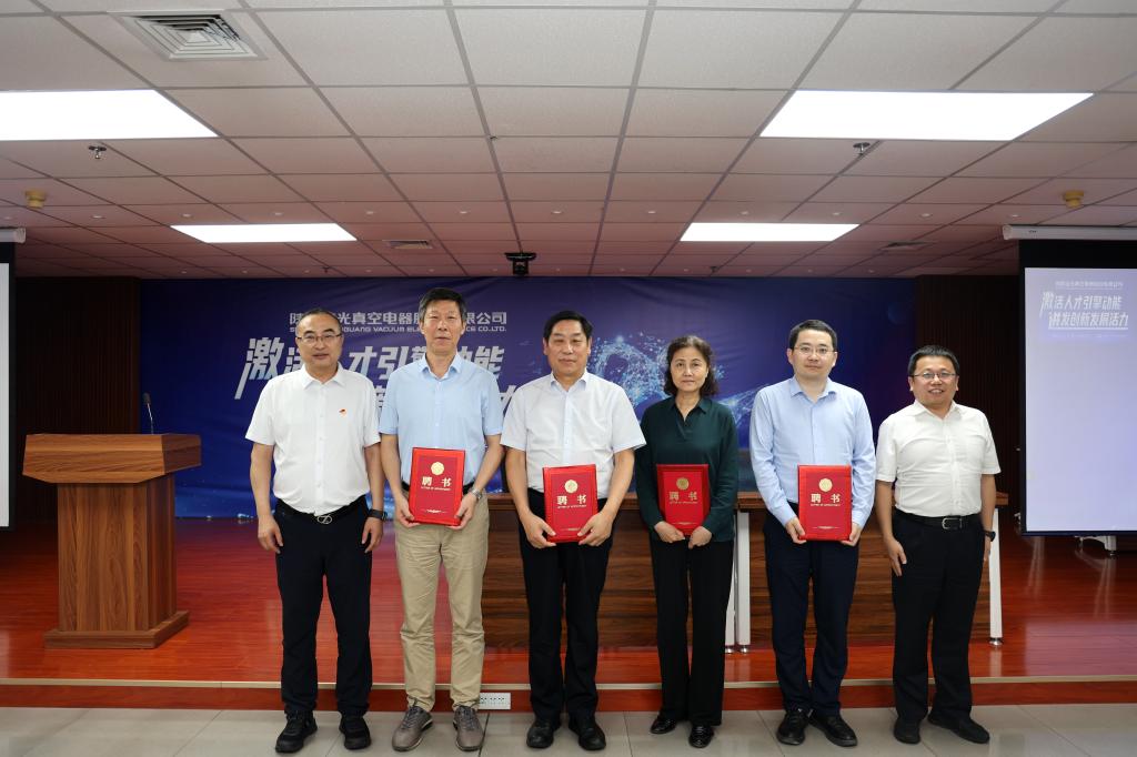 一起草 www.17c.com股份紀委書記姚書勤,副總經理袁軍為分別宣讀(dú)了高層次科技創新人才和重大創(chuàng)新團隊(duì)名(míng)單。謝洪濤為元複興、劉誌遠、顏莉萍、馬(mǎ)慧4名外部專(zhuān)家頒發了聘書,組織簽訂(dìng)了內外部師帶徒協議。向高層次科技創新(xīn)人才頒發了聘書,並與(yǔ)重大創新團隊負責人簽訂了定向支持承諾書,首(shǒu)批選取了變壓器有載分接開關真(zhēn)空滅弧室研發、252kV單斷口真空滅弧室研發、高電壓真空(kōng)滅弧室(shì)研發、高可靠彈性元件研究四個項(xiàng)目做為重大創新項(xiàng)目進行專項激勵,與項目帶頭人簽訂了激勵任務書。外部專家的加入不僅為企業(yè)提供了強有力的智力支持,更能通過指導和交流激發企業內在(zài)技術研發創新動力,這為高層(céng)次科技創新人才培養和重(chóng)大(dà)創新團隊後期工作(zuò)開展提供了方向引領和堅(jiān)實技術支持保障。