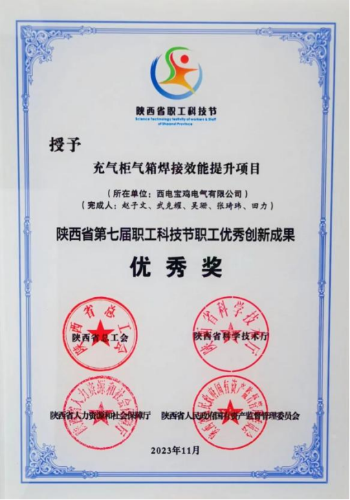 陝西省職工優秀創新成果優秀獎——西電寶雞電氣“充氣櫃氣箱焊接效能提升項目”