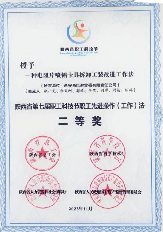 陝西省職工先進操作(工作)法優秀獎(jiǎng)——西電避雷器(qì)“一種提高電阻片造粒料回收率和質量(liàng)的(de)先(xiān)進操作方法”