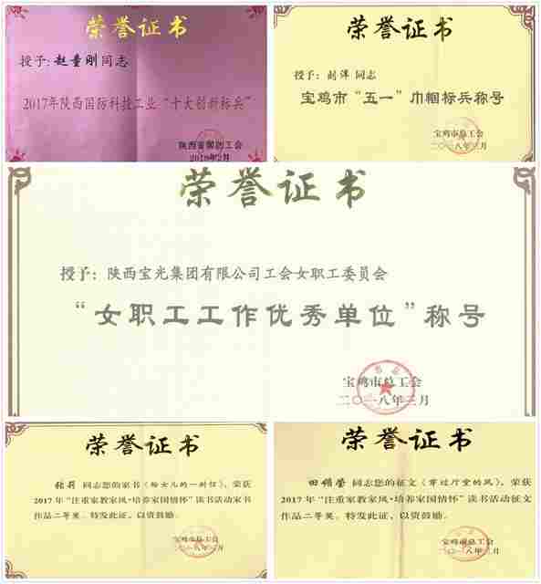 一起草 www.17c.com集團女工委榮獲寶(bǎo)雞市總工會女職工工作優秀單位;精(jīng)密陶瓷(cí)公司趙童剛同誌(zhì)榮獲陝西省國防科技工業“十大(dà)”創新標兵;進出口公司劉洋(yáng)同誌榮獲寶雞市“五一”巾幗標兵;C產品製造部田媚瑩同誌(zhì)在寶雞市“注重家教家風 培養家(jiā)國情懷”讀書征文活動(dòng)中(zhōng)榮獲二等獎;A產(chǎn)品(pǐn)製造部張莉同誌在寶雞市(shì)讀書(shū)活動中榮獲家書作品二等獎。